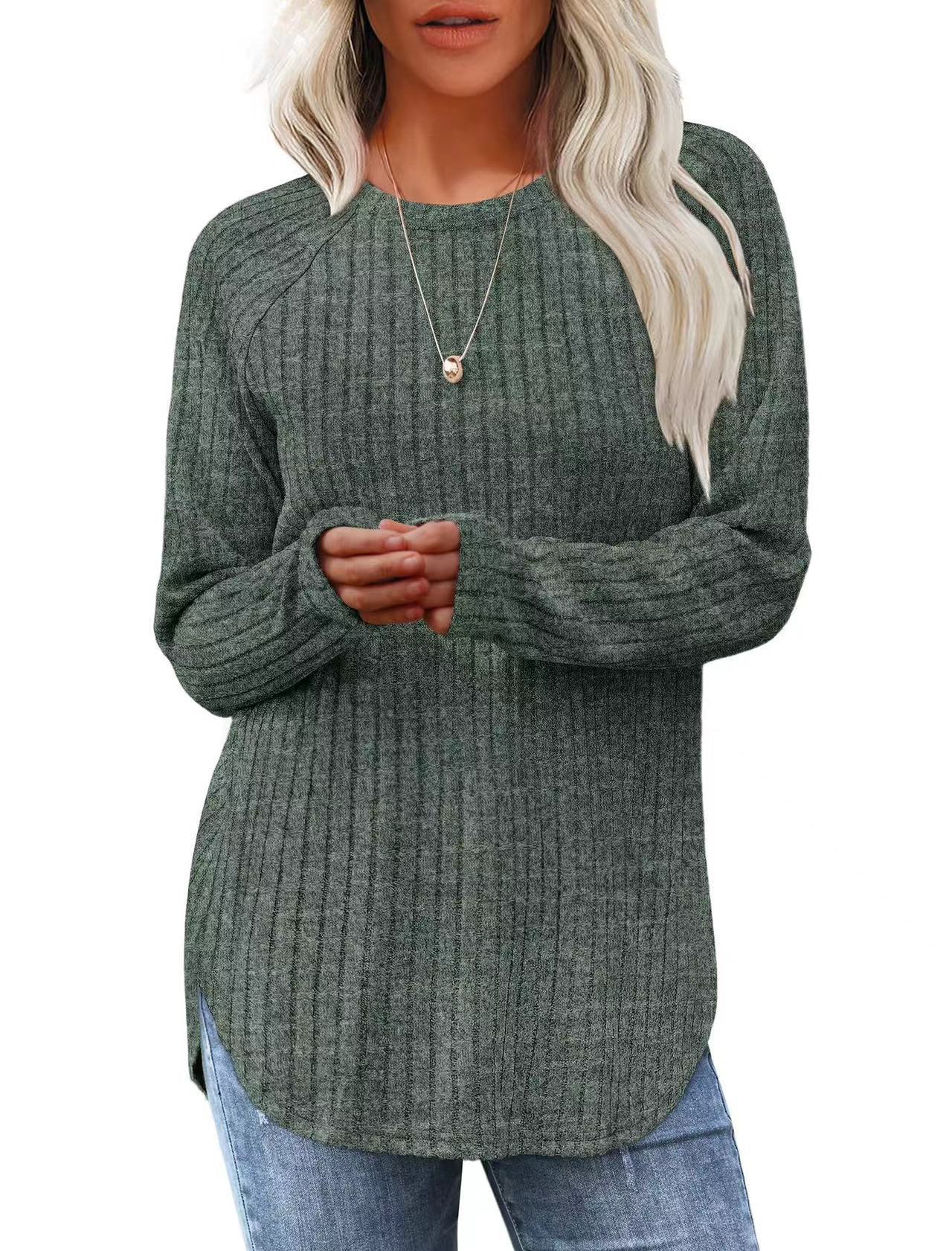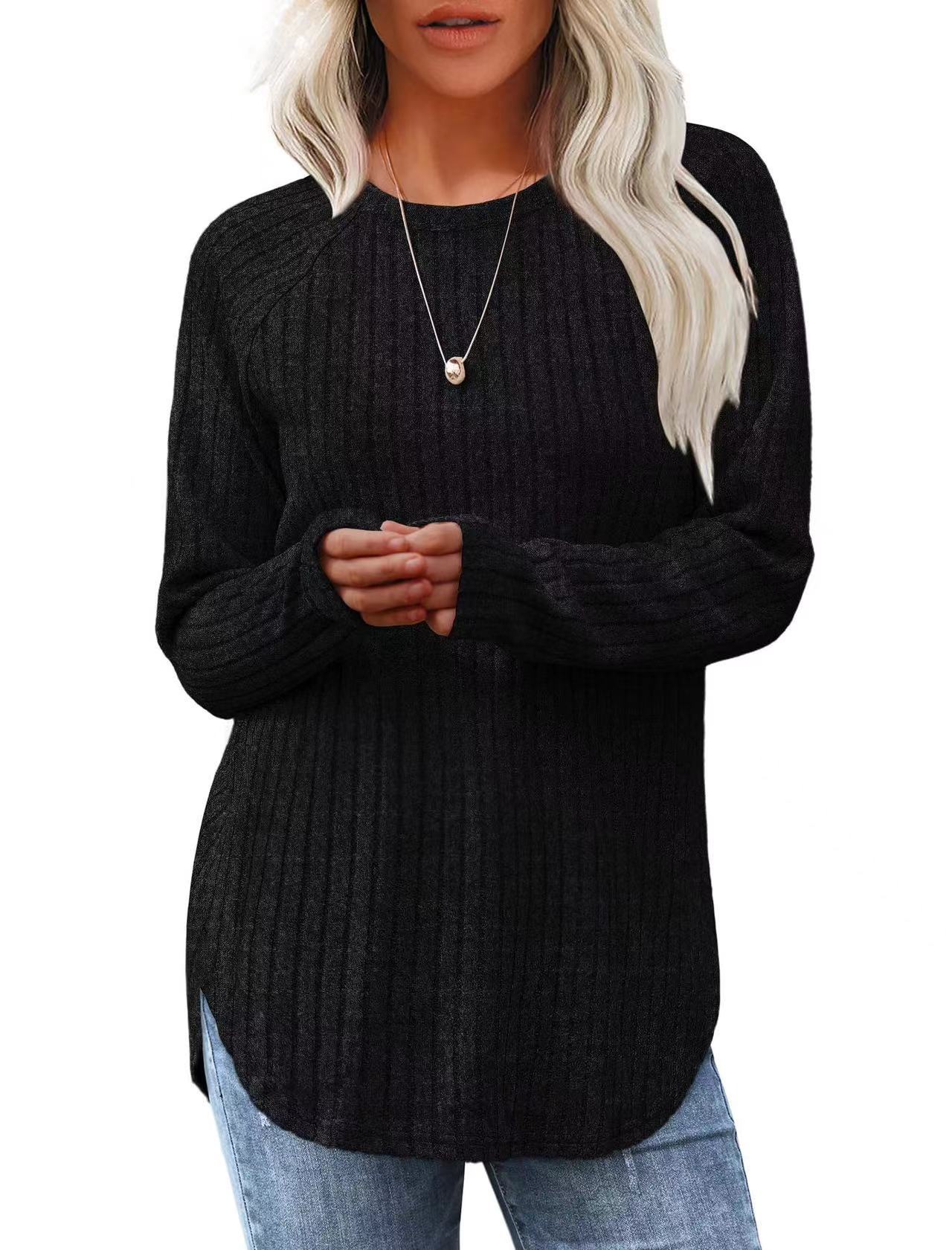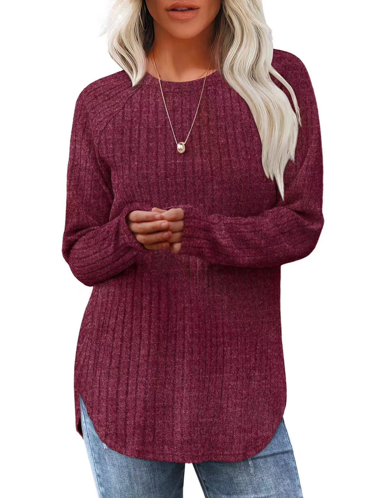 New autumn and winter collection: brushed pit stripe, round neck, curved hem, solid color, long sleeves