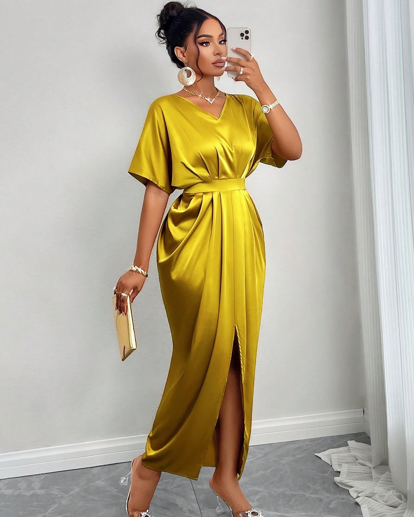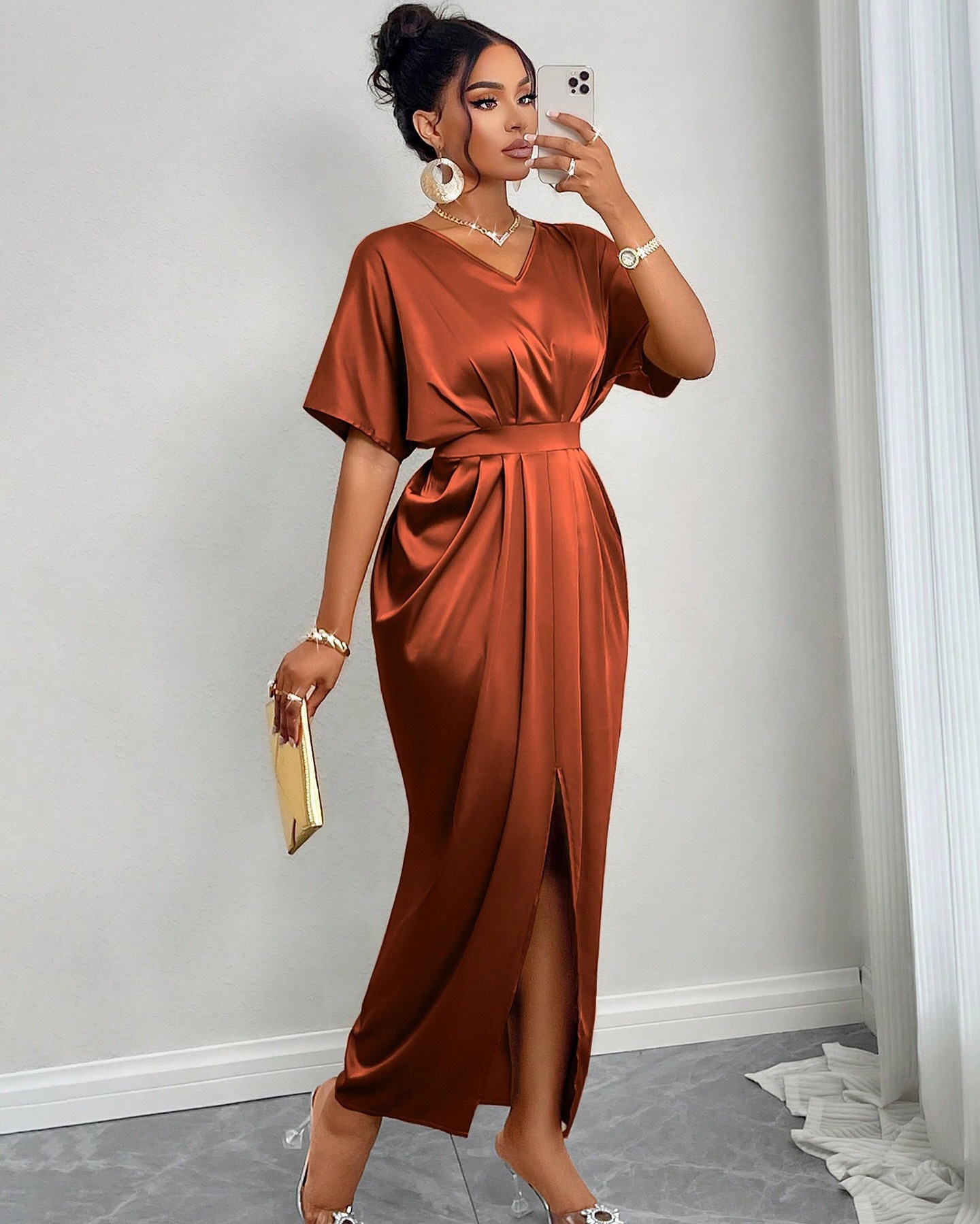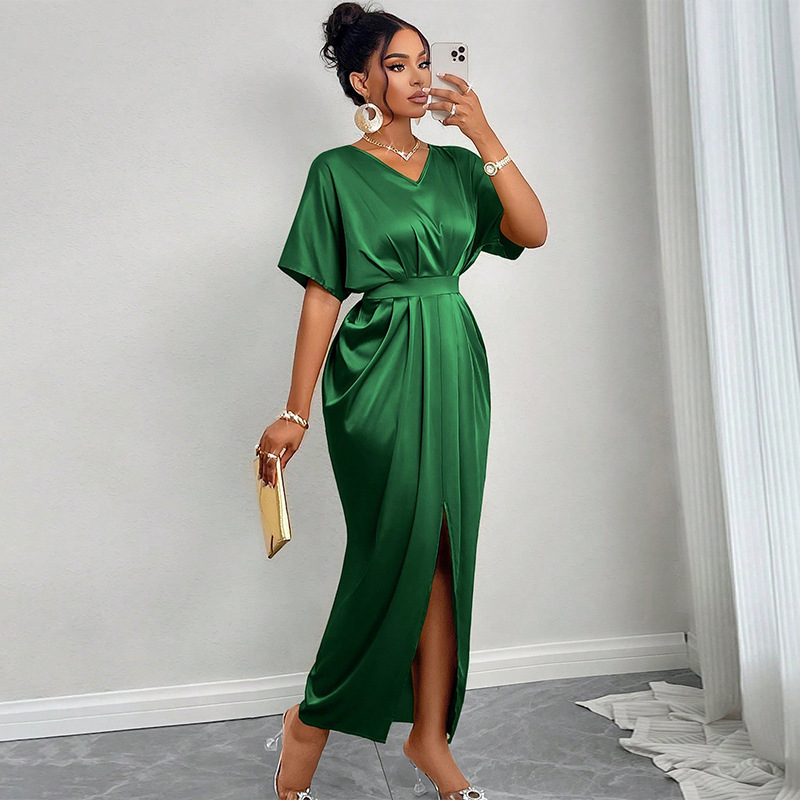 Women Dresses European and American 2025 New Elegant V-neck Short Sleeve High Waist One Step Split dress Dress Women