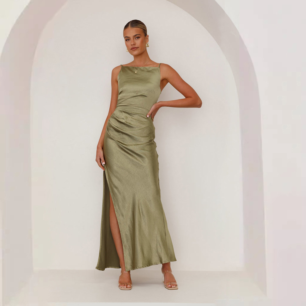 2025 spring and summer women's clothing new solid color sexy backless split mid-length skirt sleeveless strap dress women