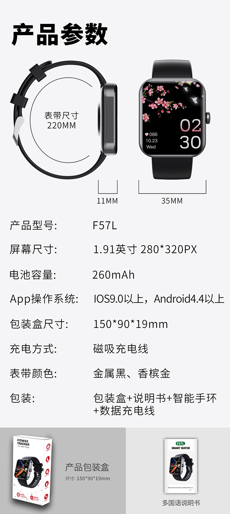 New F57L Smart Watch heart rate thermometer step sports watch information push sleep monitoring smart bracelet