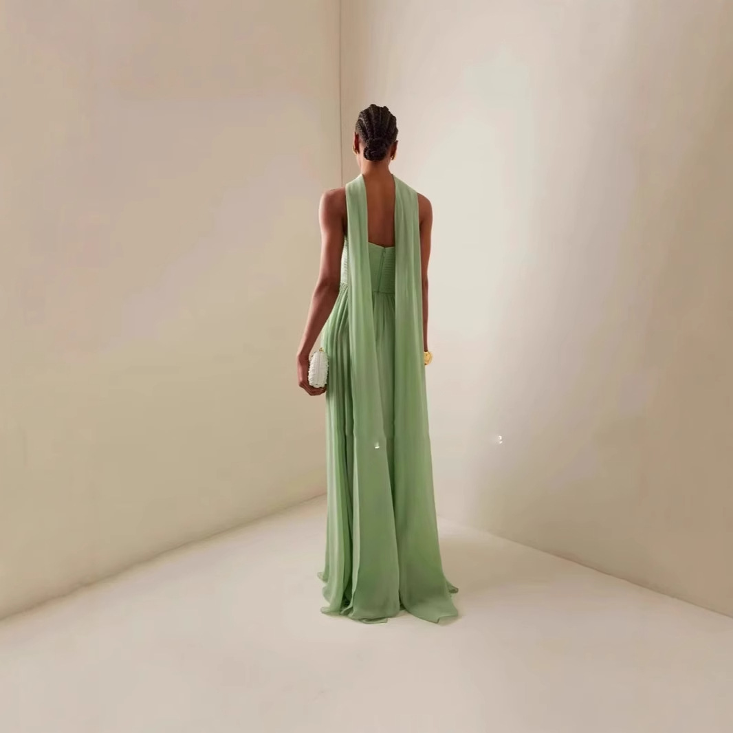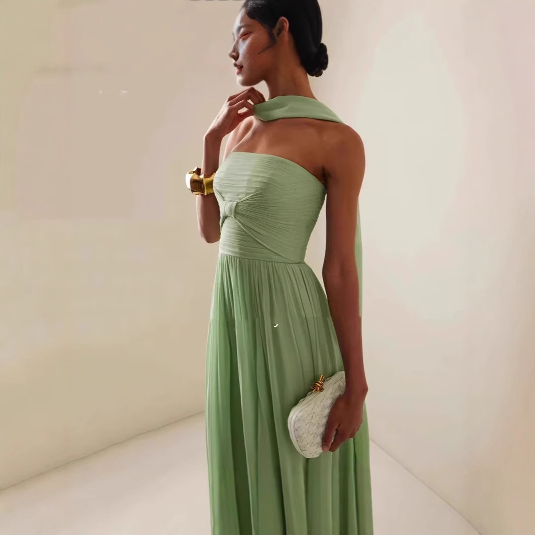 2025 Autumn European and American Amazon Cross-Border Green Shoulderless Pleated Chiffon Evening Dress Dress