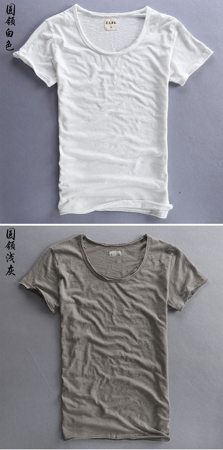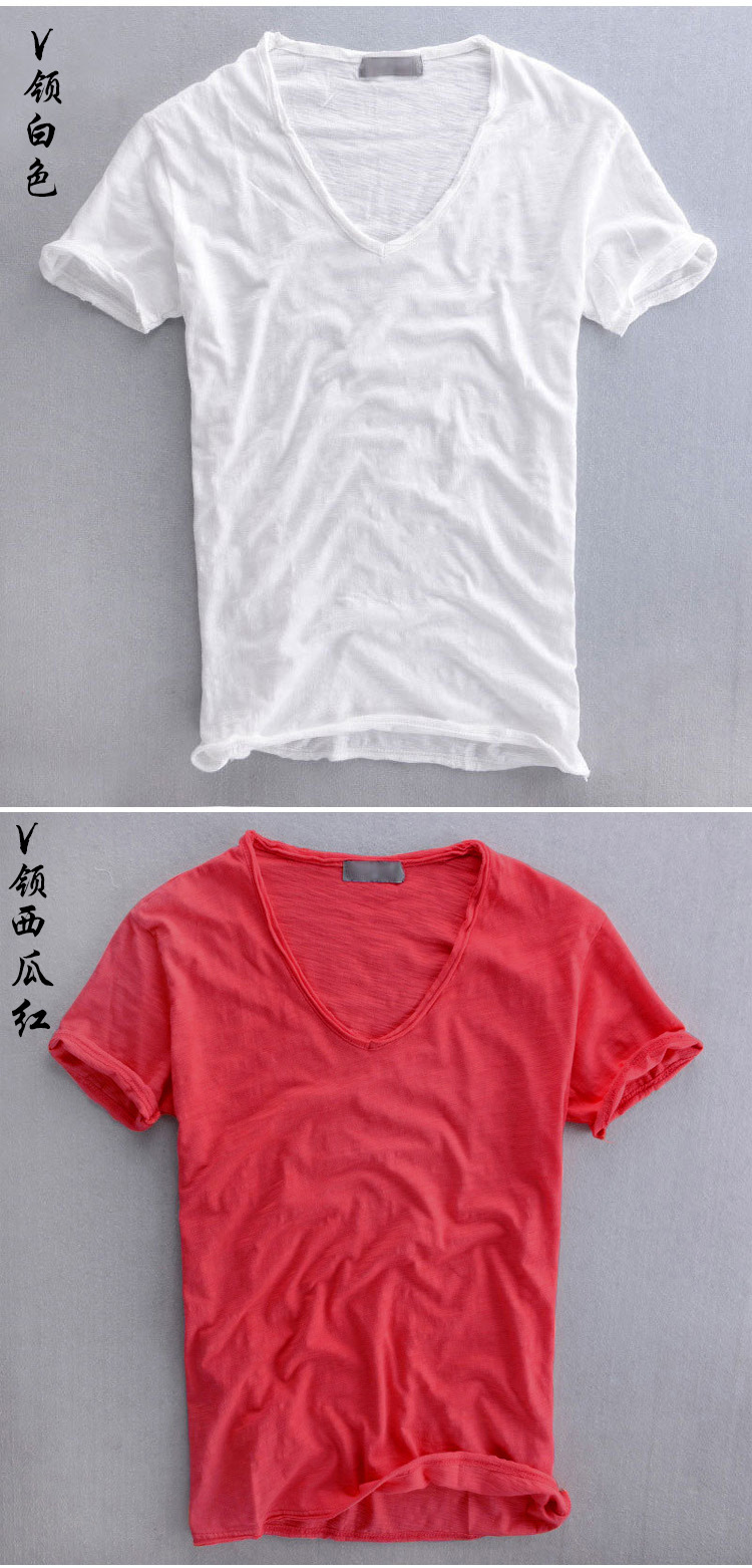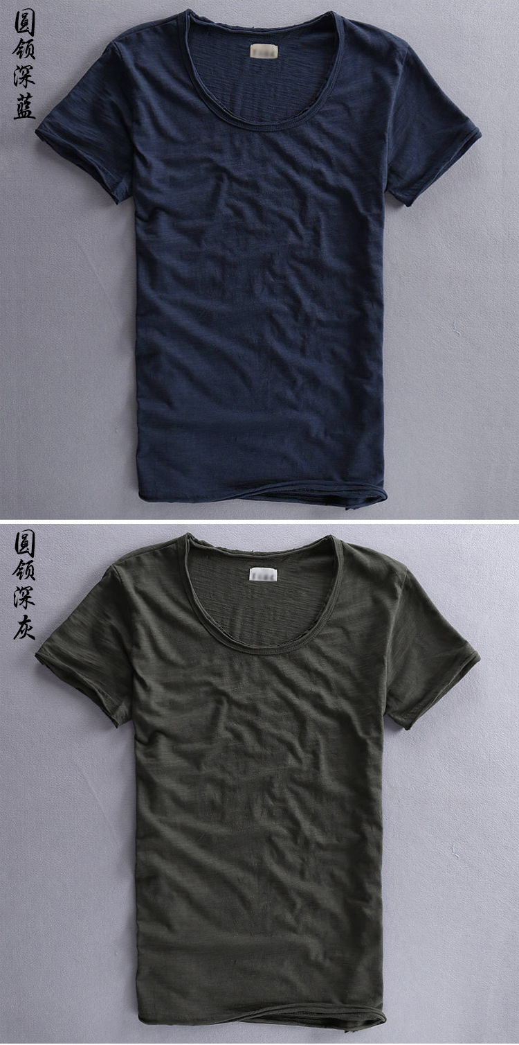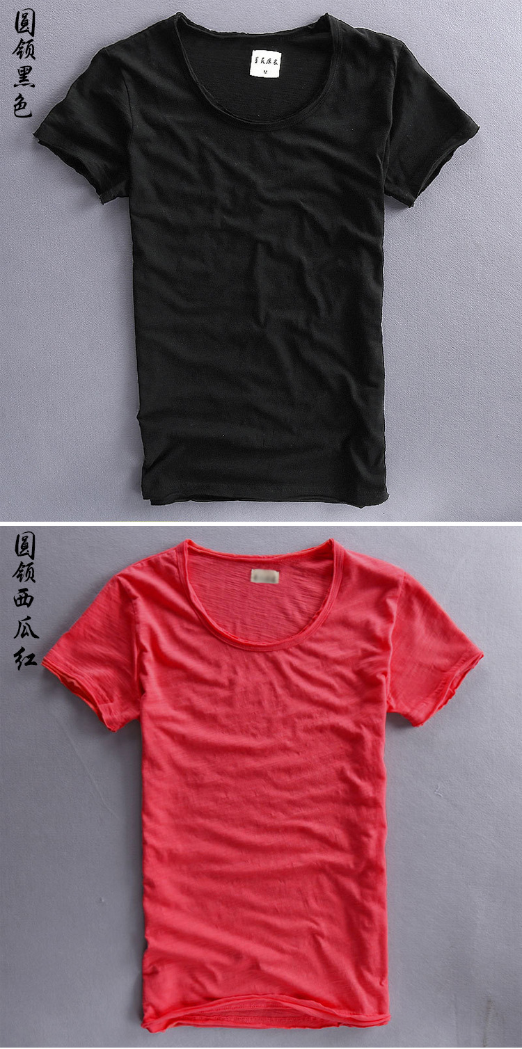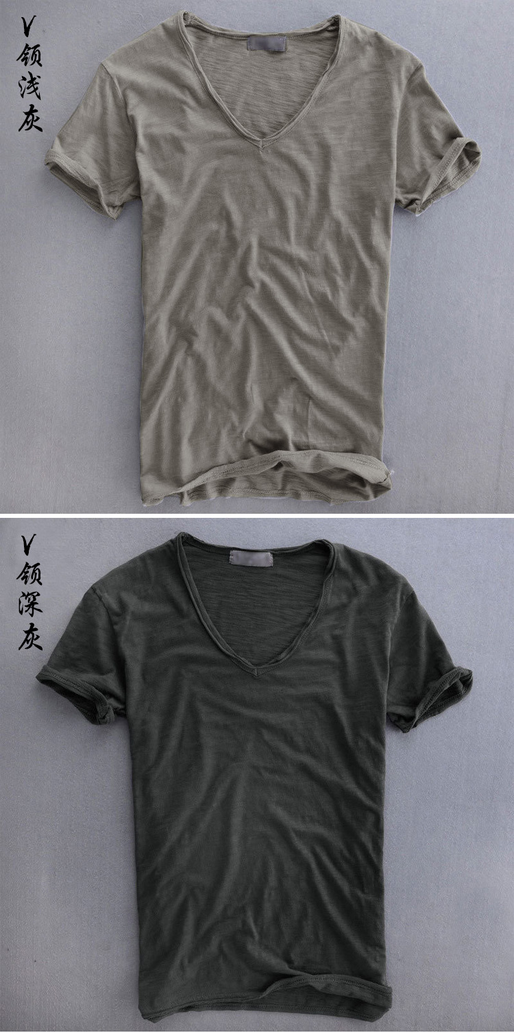 Linen Summer Bamboo CoTTon Men's ShorT-sleeVed T-shirT European and American Simple Pure Color T-shirT V Neck Slim Raw Edge Old Thin T