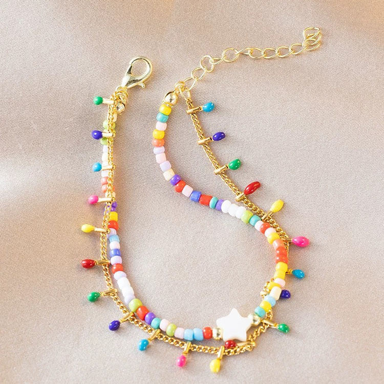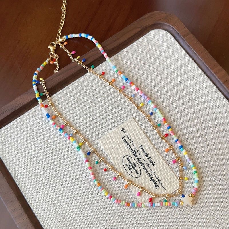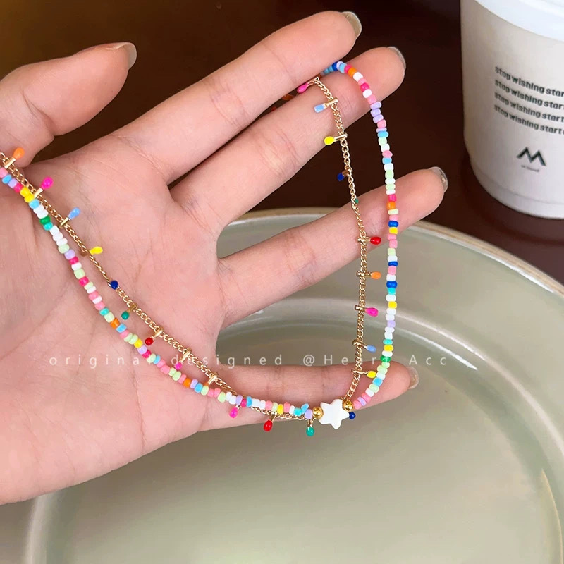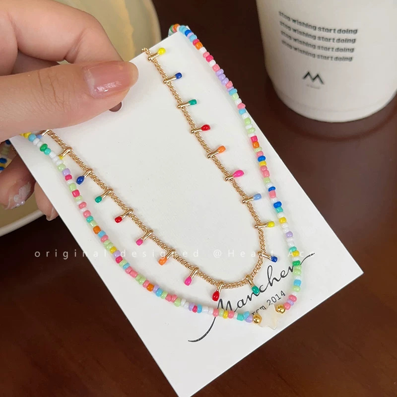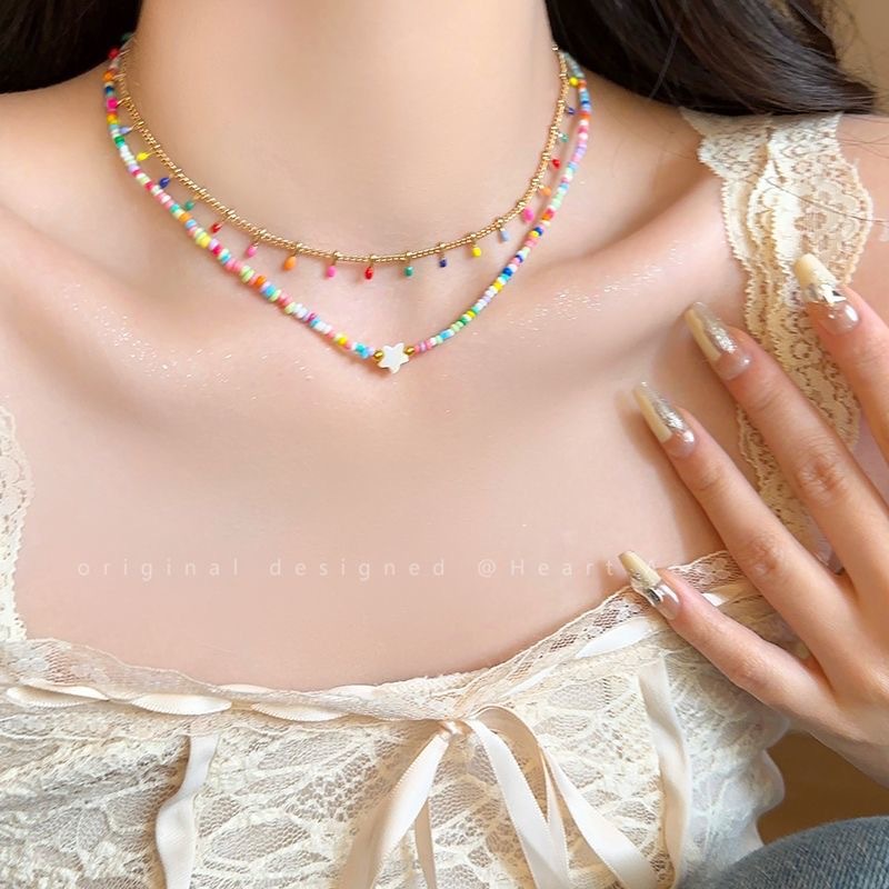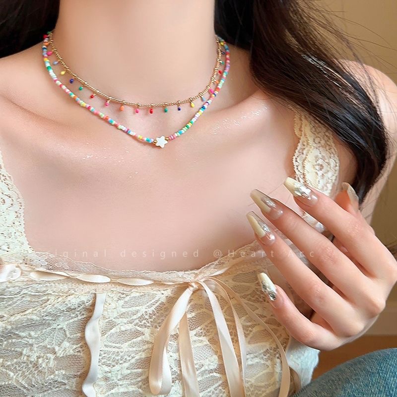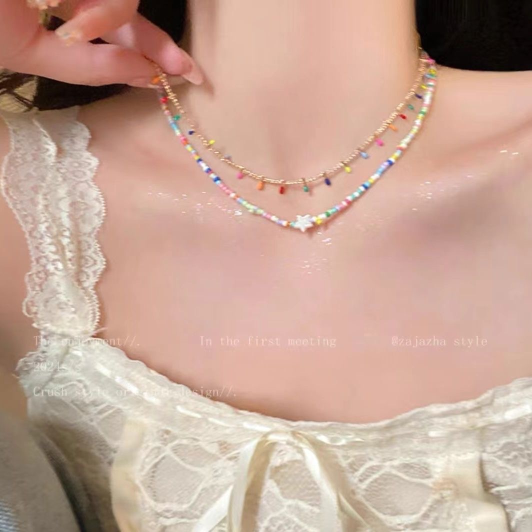 Dopamine Color Beaded Star Necklace Women's Double Layered Elegant Clavicle Chain Niche Exquisite All-match Neck Chain