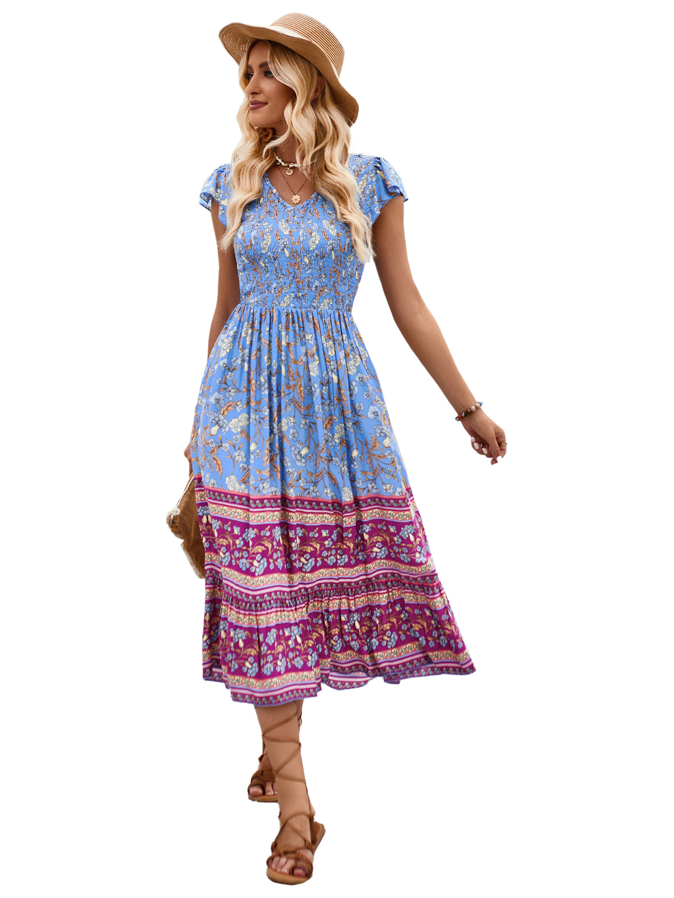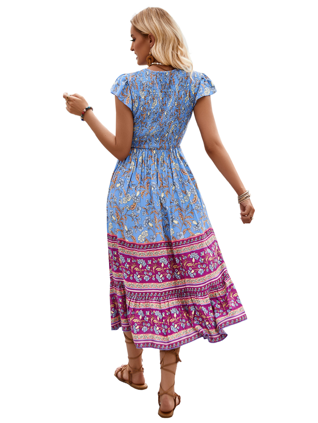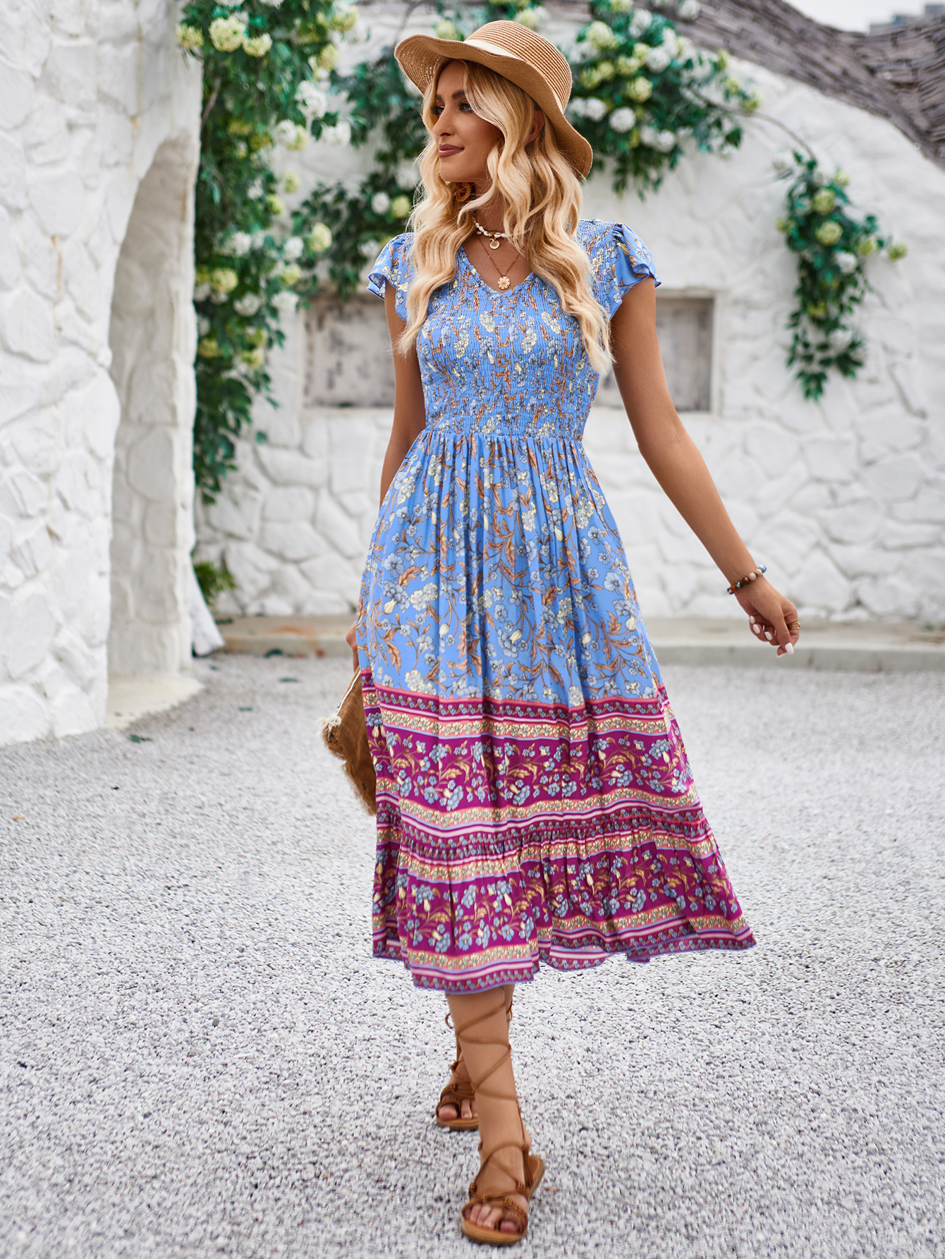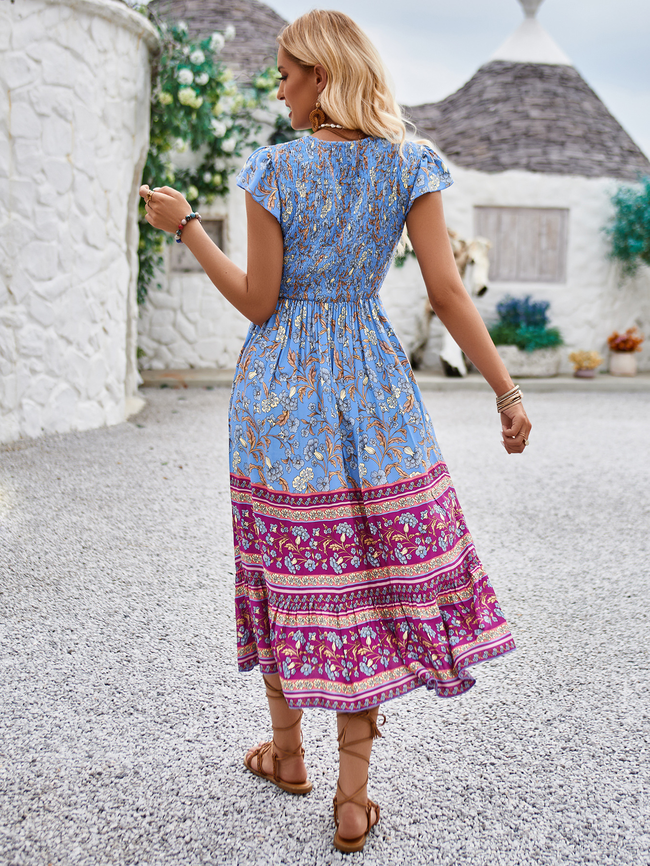 2024 summer casual dress Amazon new printed V-neck flying sleeve bohemian style dress