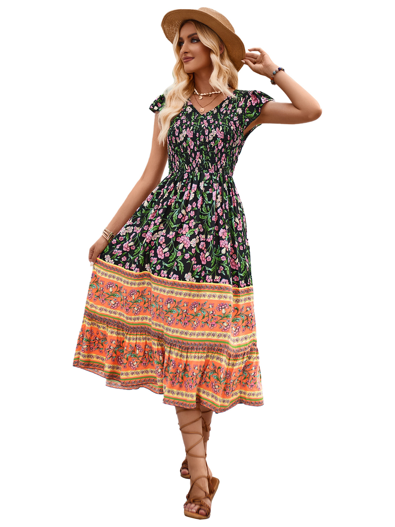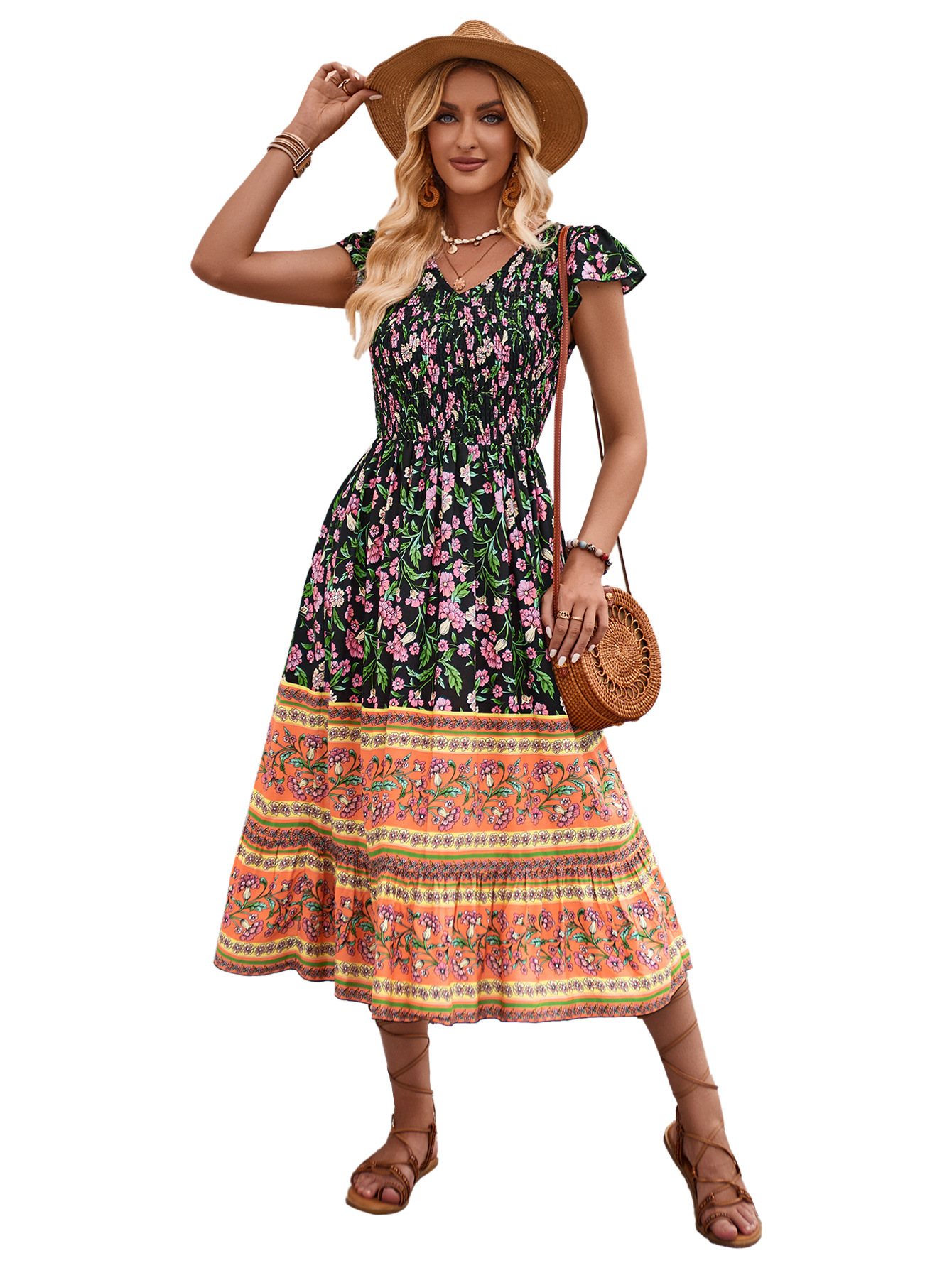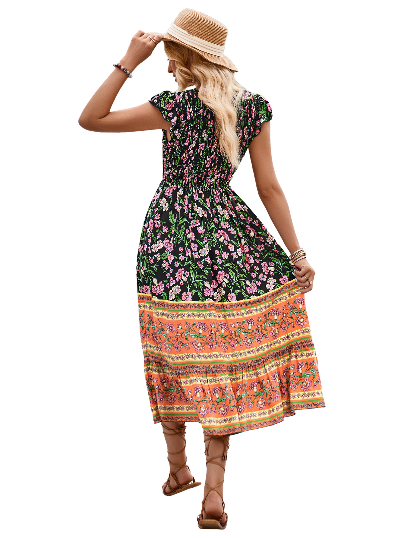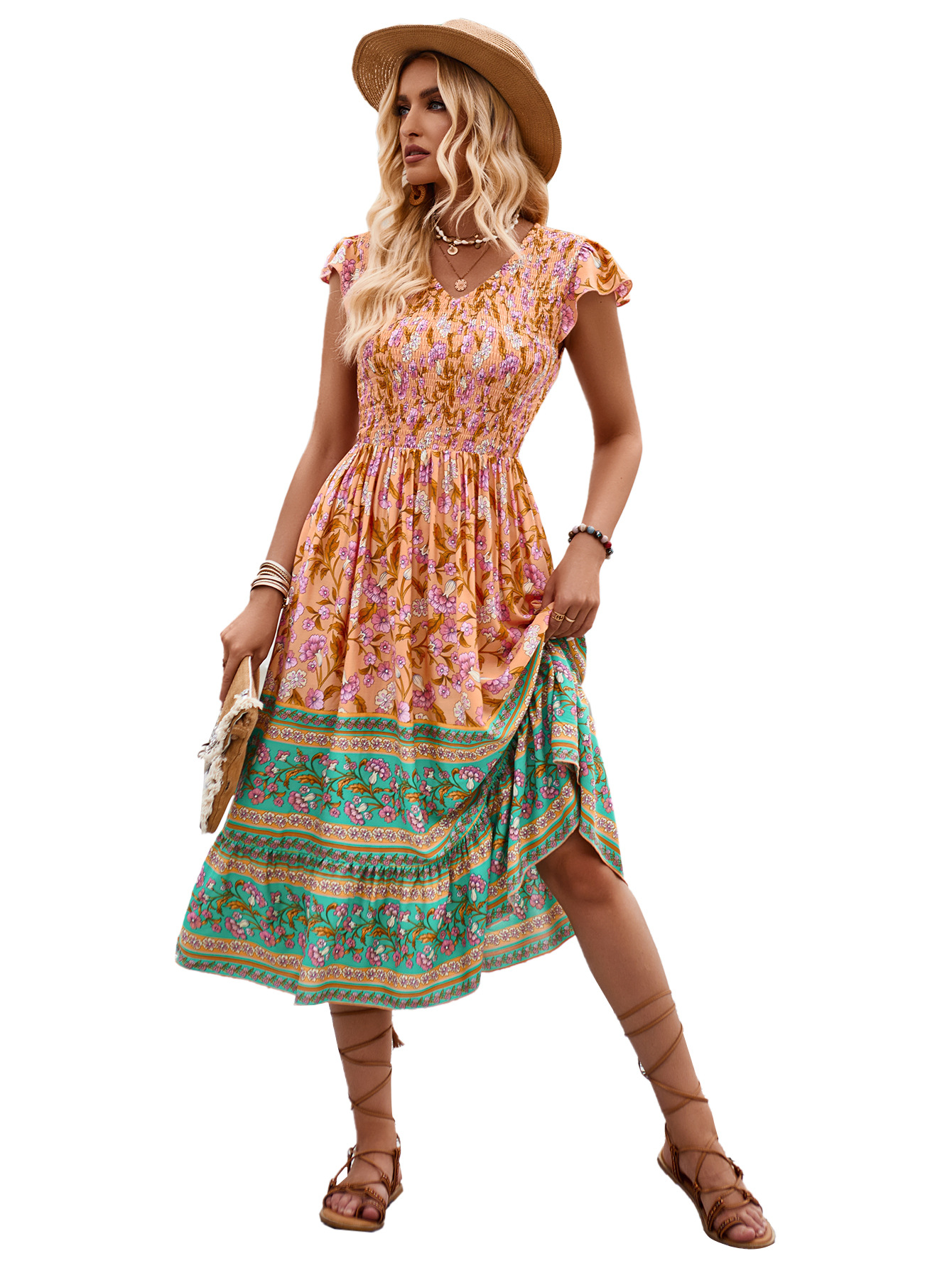 2024 summer casual dress Amazon new printed V-neck flying sleeve bohemian style dress