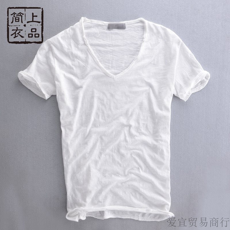 Linen Summer Bamboo CoTTon Men's ShorT-sleeVed T-shirT European and American Simple Pure Color T-shirT V Neck Slim Raw Edge Old Thin T