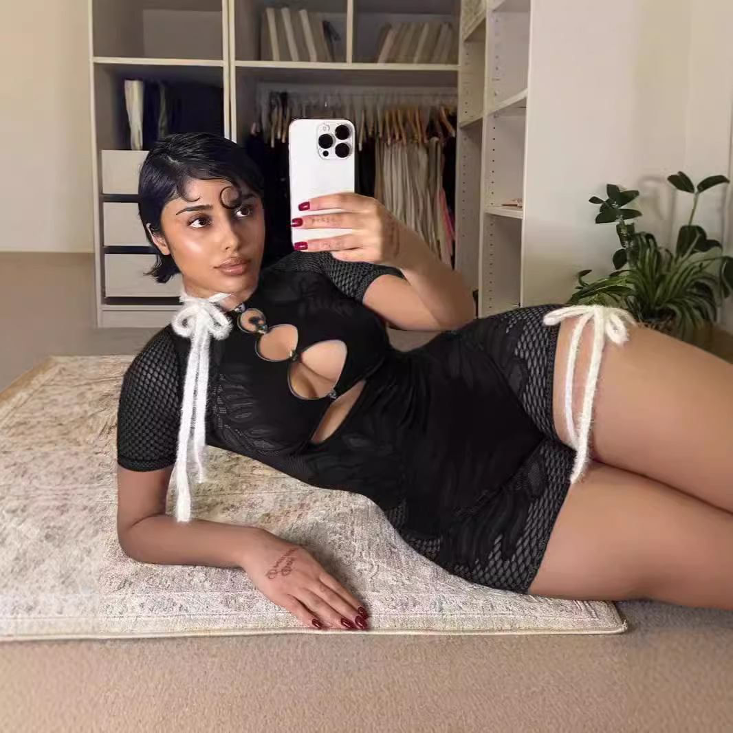 Slim Fit Hollow out Knitted Shortie Bodysuit Five Sleeve Lace Street Style Casual Set for Women European And Middle East Market