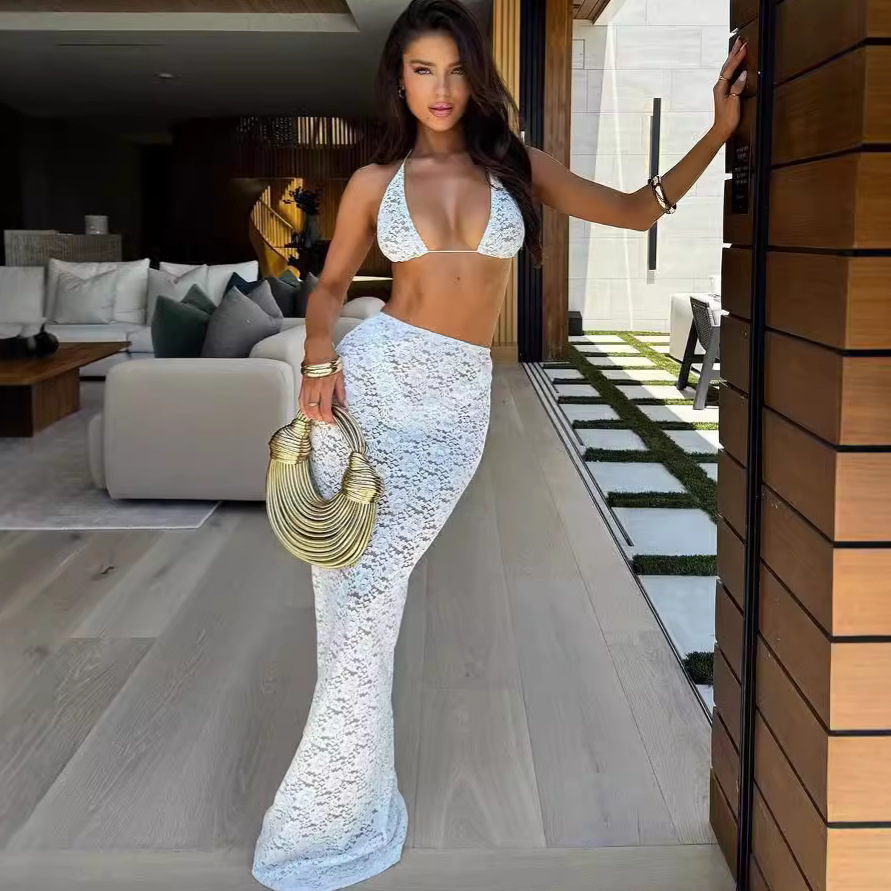 2025 European and American New Beach Holiday dress Perspective Sexy Backless Two-Wear Spring and Summer Knitted Blouse Long Skirt Women