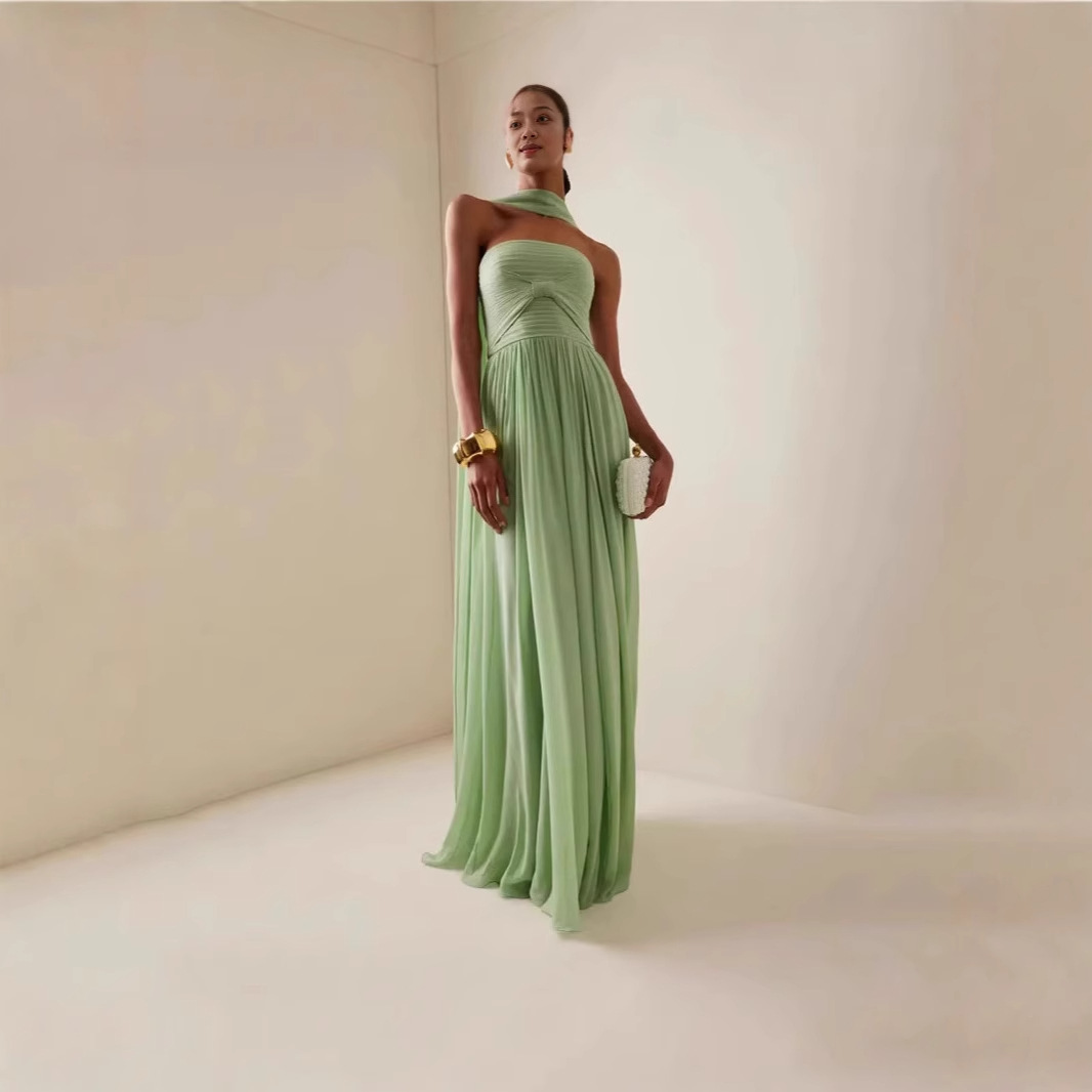 2025 Autumn European and American Amazon Cross-Border Green Shoulderless Pleated Chiffon Evening Dress Dress